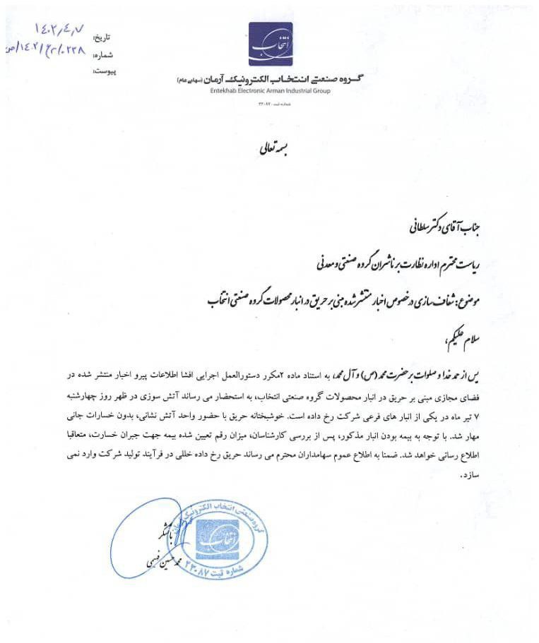 اطلاعیه رسمی گروه صنعتی انتخاب الکترونیک درباره مهار حادثه آتش‌سوزی در شهرک صنعتی مورچه‌خورت