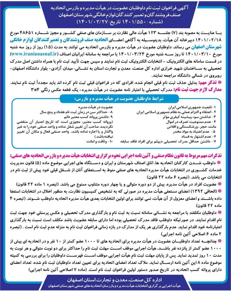 اطلاعیه ثبت نام داوطلبان عضویت در هیئت مدیره اصفهان