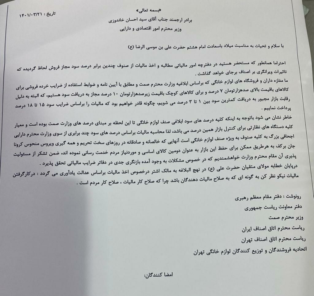 جمعی از فروشندگان لوازم خانگی در نامهای خطاب به وزیر اقتصاد نسبت به ضرایب بالای مالیاتی اعتراض کردند.