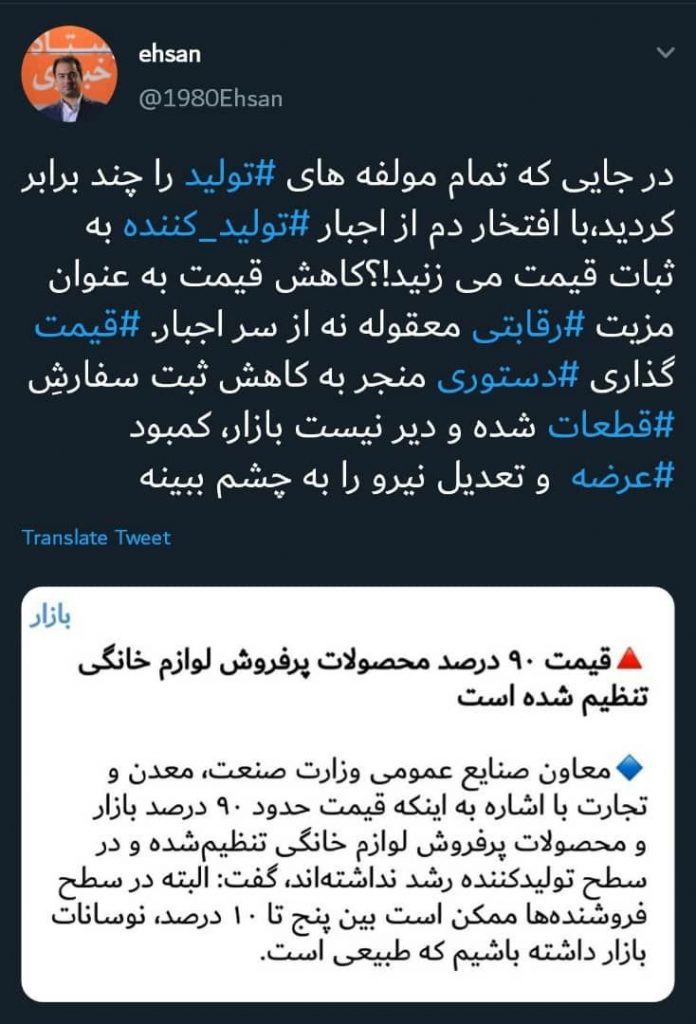 احسان فدایی در واکنش به سخنان معاون وزیر صنعت در توئیتی عنوان کرد:
