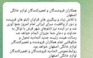 اتحادیه لوازم خانگی اصفهان در پیامی به اعضای این صنف از جمعآوری تابلوهای تبلیغاتی فروشگاه سرای ایرانی در اصفهان خبر داده است.