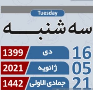 امروز سهشنبه 16دی 1399 برابر با 5ژانویه 2021 و ۲۱جمادی الاول ۱۴۴۲