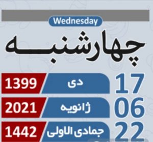 امروز چهارشنبه 17دی 1399 برابر با 6ژانویه 2021 و ۲۲جمادی الاول ۱۴۴۲