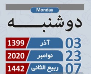 امروز دوشنبه 3آذر 1399 برابر با 23نوامبر 2020 و ۷ربیع الثانی ۱۴۴۲