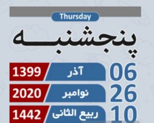 امروز پنجشنبه 6آذر 1399 برابر با 26نوامبر 2020 و ۱۰ربیع الثانی ۱۴۴۲