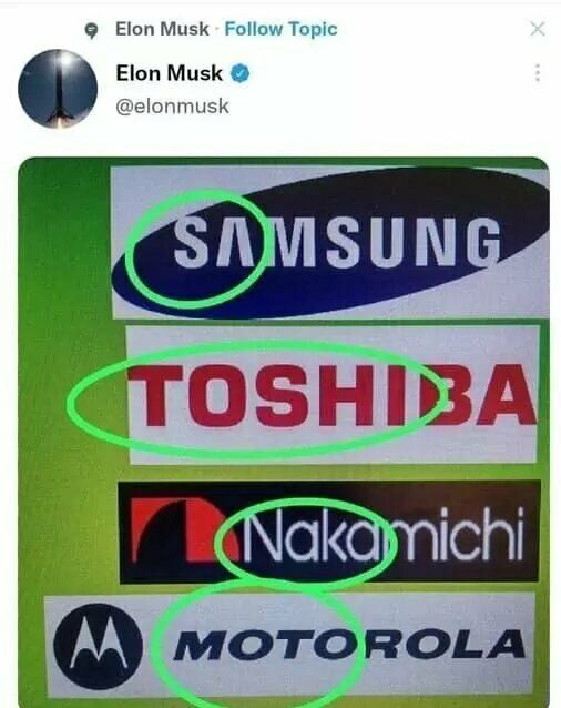 به گزارش شبکه لوازم خانگی، مدیرعامل شرکت اسپیس ایکس و صاحب ماهوارههای بیشمار استارلینک در توئیتر خود لوگوی چهار برند معروف سامسونگ، توشیبا، ناکامیچی و موتورولا را به اشتراک گذاشته و دور حروف آغازین آنها دایره کشیده و از اتصال این حروف دقیقا نام ساتوشی ناکاموتو دریافت میشود.