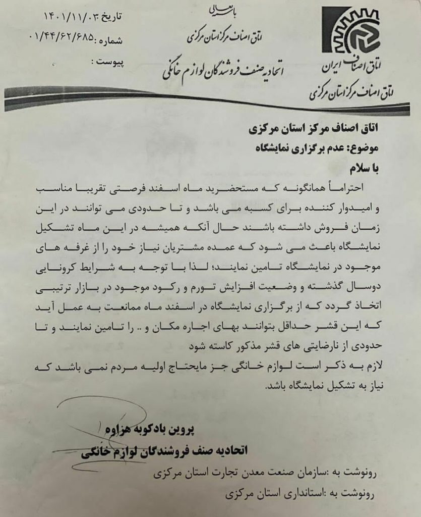 به گزارش شبکه لوازم خانگی، پروین بادکوبه در این نامه لغو این نمایشگاه را در جهت کاهش میزان نارضایتی صنف لوازم خانگی عنوان کرده است.