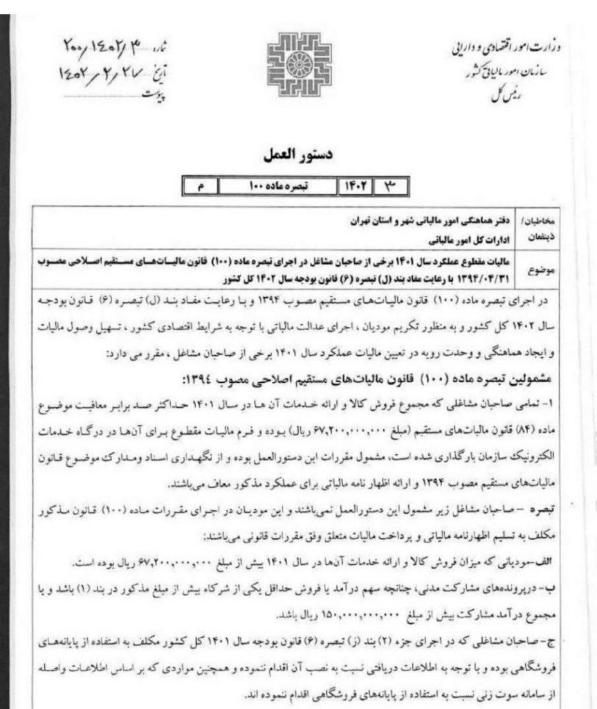 سازمان امور مالیاتی دستورالعمل مالیات مقطوع عملکرد سال ۱۴۰۱ را ابلاغ کرد.