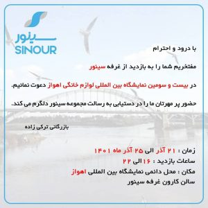مفتخریم شما را به بازدید از غرفه سینور در بیست و سومین نمایشگاه بین‌المللی اهواز دعوت نمائیم.