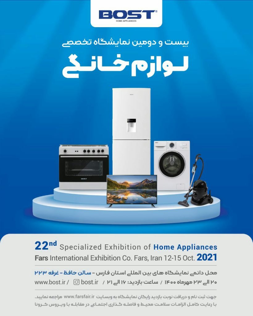 برند بُست جهت بازدید از غرفه این برند در بیست و دومین نمایشگاه لوازم خانگی شیراز از شما دعوت میکند.