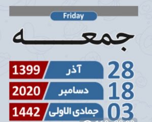 امروز جمعه 28آذر 1399 برابر با 18دسامبر 2020 و ۳جمادی الاول ۱۴۴۲