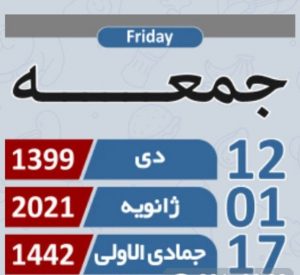 امروز جمعه 12دی 1399 برابر با 1ژانویه 2021 و ۱۷جمادی الاول ۱۴۴۲