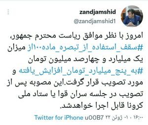 جمشید زند، رئیس اتاق اصناف مرکزی در توئیتی از سقف استفاده از ماده۱۰۰ خبر داد: