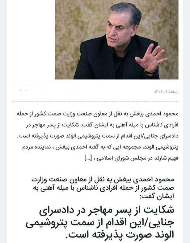 احمدی‌بیغش همچنین مدعی شد که با میله آهنی به برادران حمله کردند و این پرونده در دادسرای جنایی در حال پیگیری است.