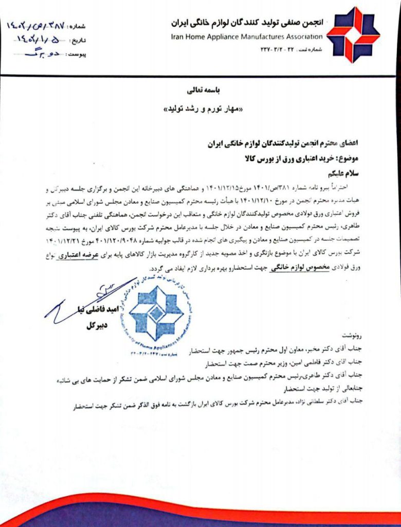 با تلاش و پیگیریهای انجمن تولیدکنندگان لوازم خانگی عرضه انواع ورق فولادی مخصوص تولیدکنندگان لوازم خانگی از شرایط پیش واریز به شرایط اعتباری تغییر کرد!