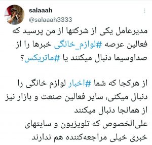 مدیرعامل یکی از شرکتها از من پرسید که فعالین عرصه لوازم خانگی خبرها را از صداوسیما دنبال میکنند یا ماتریکس؟