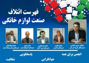 فهرست ائتلاف صنعت لوازم خانگی با حضور آقایان سلطان حسین فتاحی، محمود قهاری، محمدرضا جعفری، عباس ابهری و محمد فرهادکیائی منتشر شد.