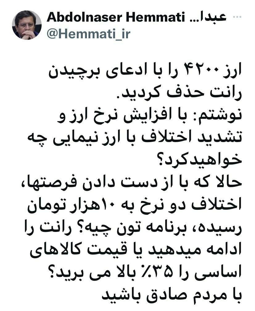 عبدالناصر همتی در توئیتی در واکنش به افزایش قیمت ارز، نوشت: