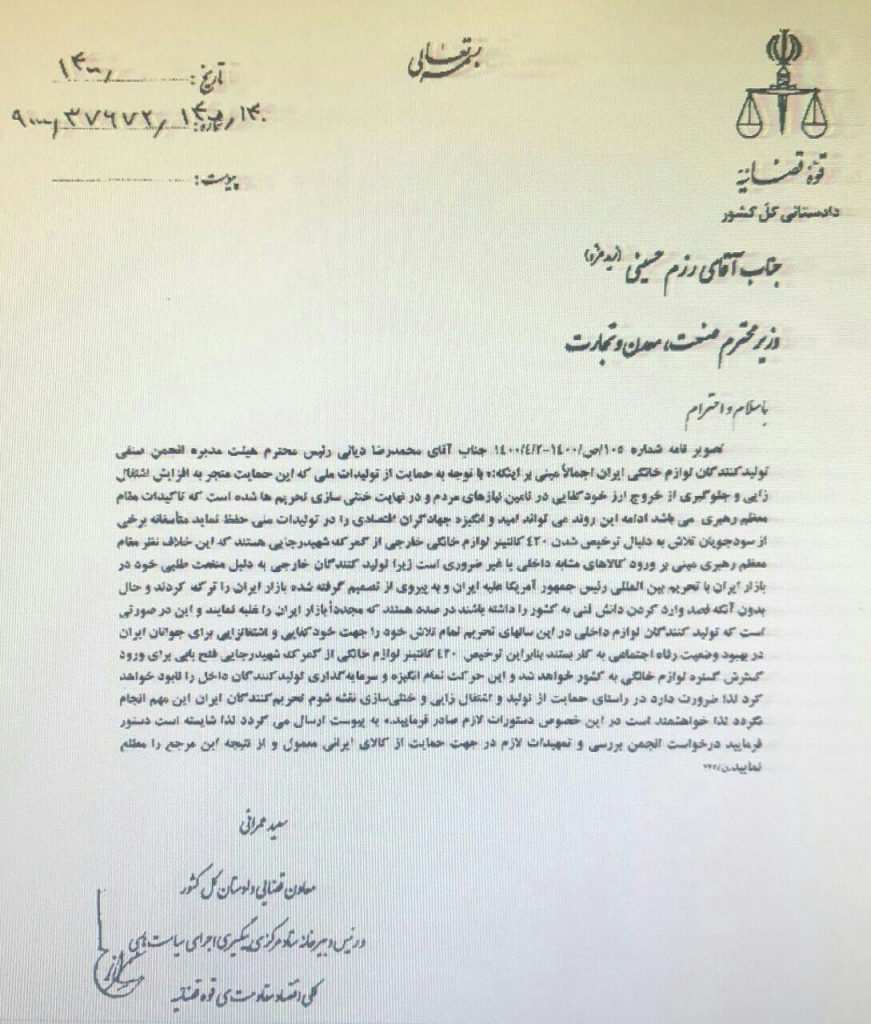 به گزارش شبکه لوازم خانگی، در این نامه که تصویر آن در بالا آمده است؛ معاون قضایی دادستان کل کشور به نامه محمدرضا دیانی اشاره میکند و به وزیر صمت در خصوص عواقب ترخیص این کالاها هشدار میدهد.