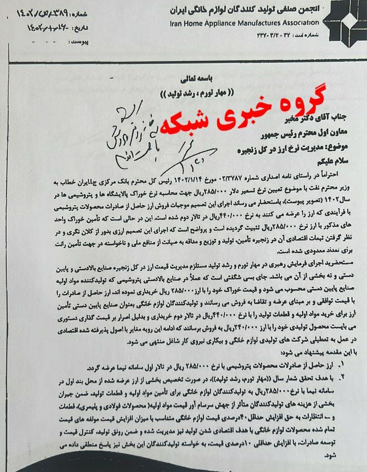 دبیر انجمن تولیدکنندگان لوازم خانگی در نامه‌ای به معاون اول رئیس جمهور خواستار مدیریت نرخ ارز در کل زنجیره تولید شد.