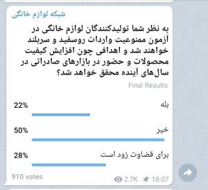 در اخرین نظرسنجی شبکه لوازم خانگی پرسیده بودیم “به نظر شما تولیدکنندگان لوازم خانگی در آزمون ممنوعیت واردات روسفید و سربلند خواهند شد و اهدافی چون افزایش کیفیت محصولات و حضور در بازارهای صادراتی در سالهای آینده محقق خواهد شد؟”