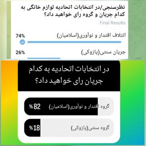 در نظرسنجی انجام شده در کانال تلگرام شبکه، ۷۴درصد مشارکت‌کنندگان به ائتلاف اقتدار و نوآوری و ۲۶درصد به جریان سنتی(پازوکی) رای دادند.