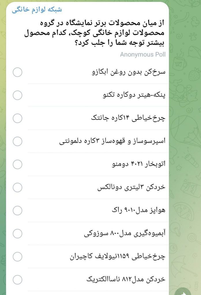 جهت شرکت در این نظرسنجی به کانال تلگرام “شبکه لوازم خانگی” مراجعه فرمایید