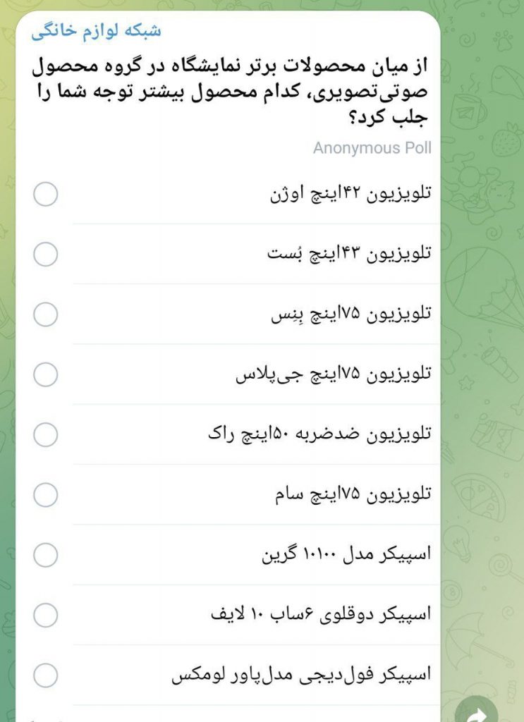 جهت شرکت در این نظرسنجی به کانال تلگرام “شبکه لوازم خانگی” مراجعه فرمایید