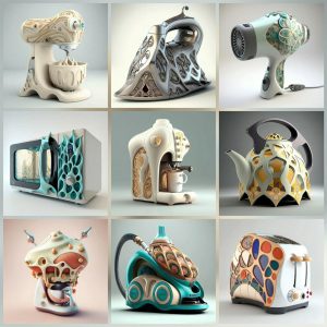 مارکوس برن با استفاده از نرمافزار تولیدکننده تصویر مبتنی بر هوش مصنوعی در ترکیب با زیباییشناسی معماری آنتونی گائودی معمار اسپانیایی، مجموعه تصاویری از لوازم خانگی با طراحیهای جالب را ارائه کرده است.